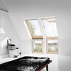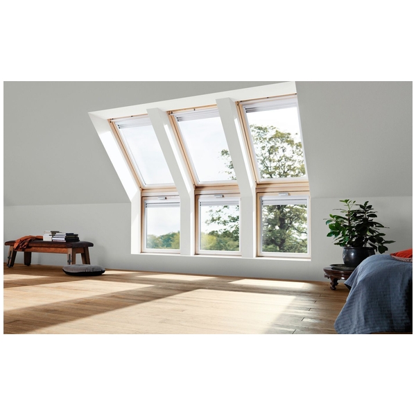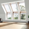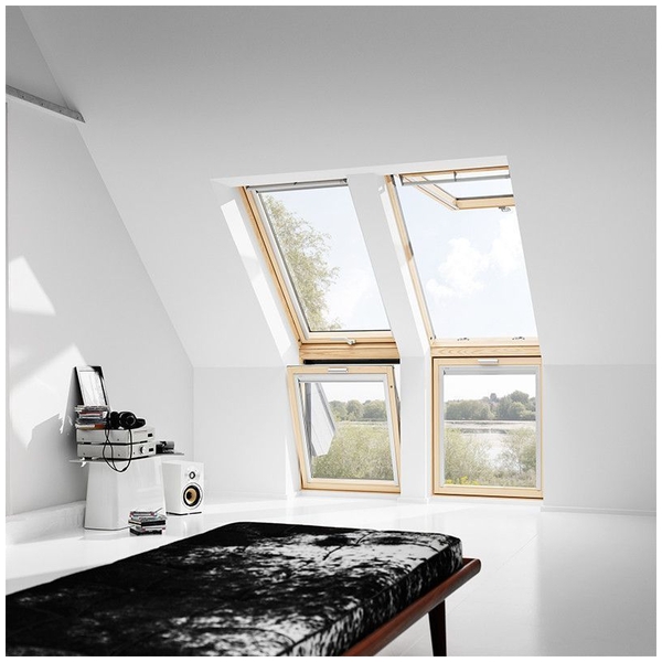 Карнизные окна устанавливаются непосредственно под мансардными окнами VELUX. В этом случае окна начинаются практически от самого пола. Они открывают превосходный вид и зрительно расширяют жилое пространство. Карнизные окна открываются по нижней оси внутрь, ручка расположена в верхней части. Представлены в двух вариантах: деревянное (VFE) и белое полиуретановое (VIU).